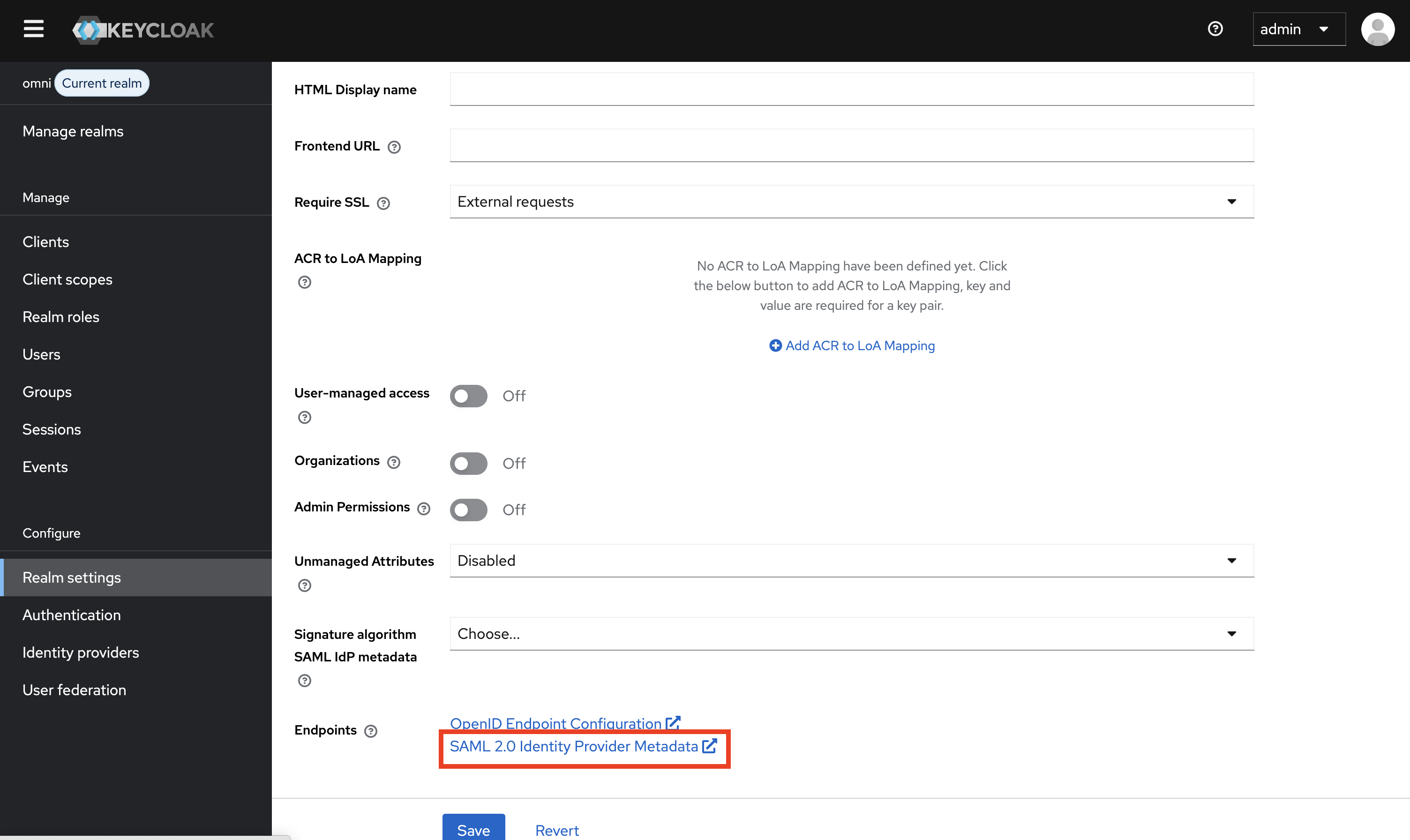 Select Realm settings in the sidebar, and navigate to the Endpoints > SAML 2.0 Identity Provider Metadata Link. The link should look a lot similar to this: