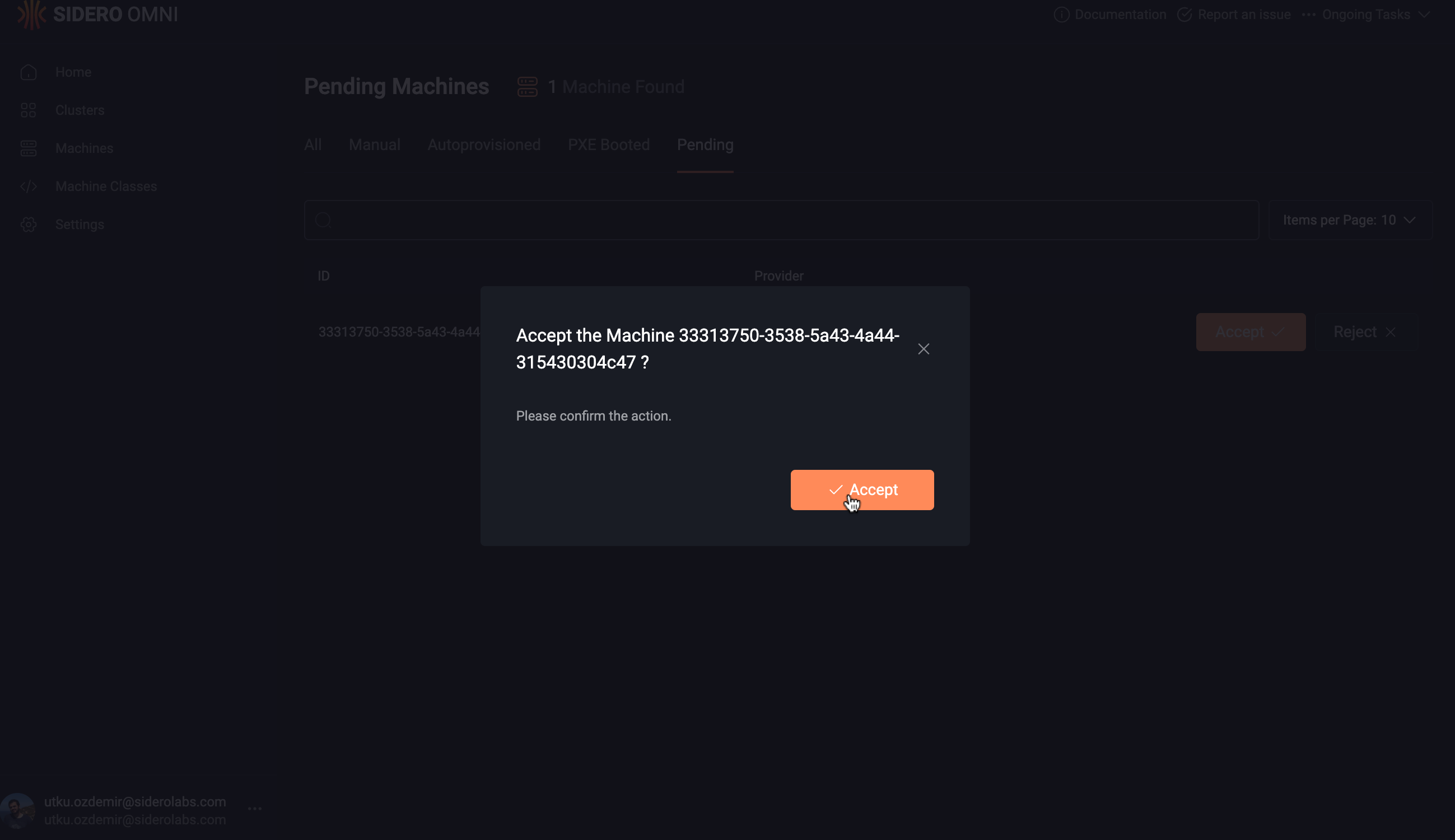 Simply click the “Accept” button on each machine under the Machines - Pending tab on the Omni web UI, and confirm the action: