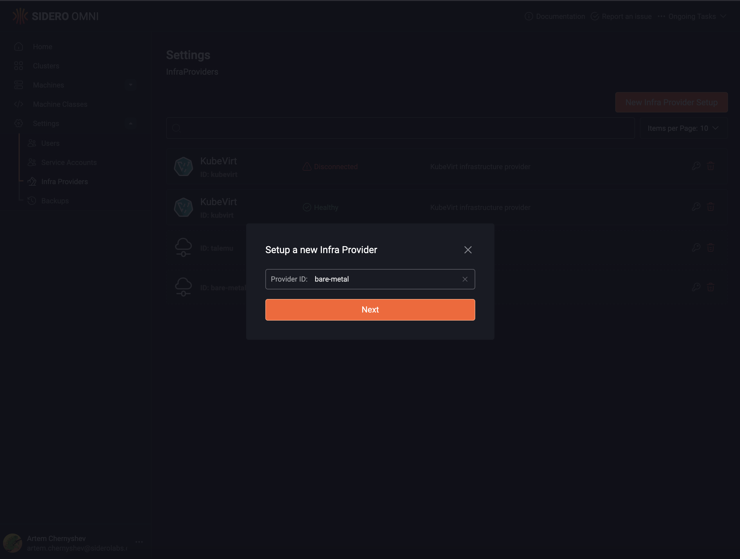 Navigate to the Settings - Infra Providers tab on the Omni web UI, and setup a new infra provider with ID