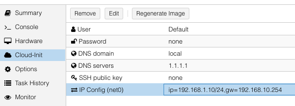 Proxmox can create cloud-init disk for you. Edit the cloud-init config information in Proxmox as follows, substitute your own information as necessary: