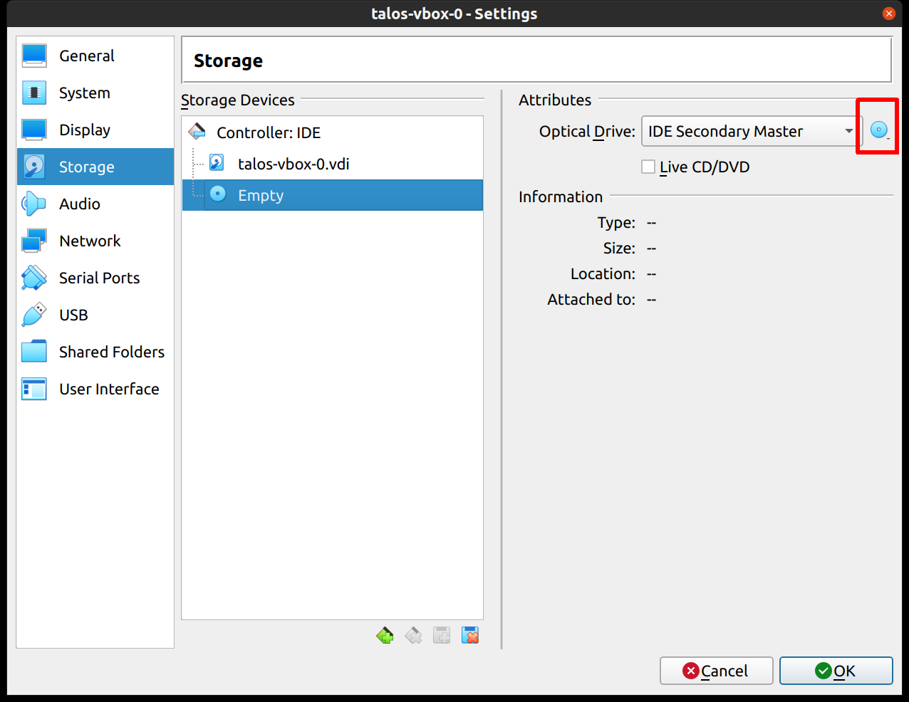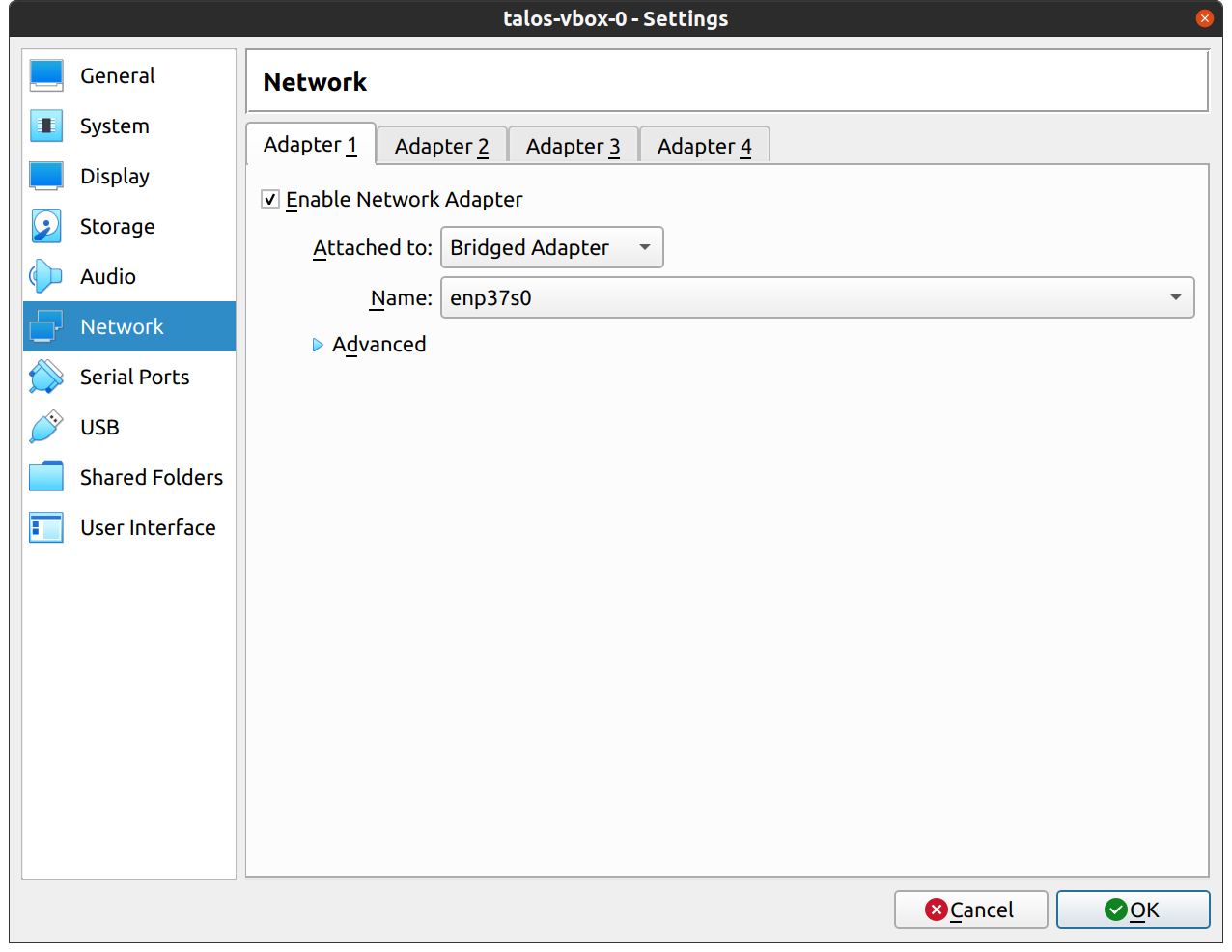 Edit the memory to supply at least 2GB of RAM for the VM: Proceed through the disk settings, keeping the defaults. You can increase the disk space if desired. Once created, select the VM and hit “Settings”: In the “System” section, supply at least 2 CPUs: In the “Network” section, switch the network “Attached To” section to “Bridged Adapter”: Finally, in the “Storage” section, select the optical drive and, on the right, select the ISO by browsing your filesystem: Repeat this process for a second VM to use as a worker node. You can also repeat this for additional nodes desired.